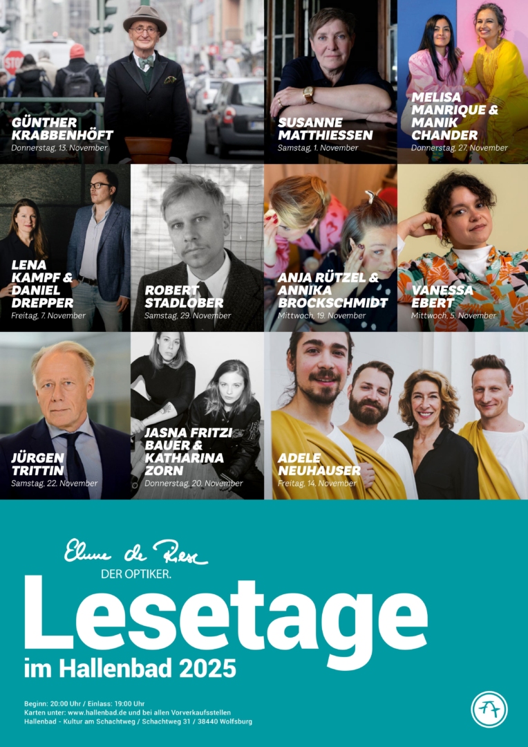 Die 16. Lesetage werden gefördert von Ehme de Riese „Der Optiker“. Die insgesamt zehn Veranstaltungen finden im November auf der großen Bühne im Nichtschwimmerbecken statt. Literaturfans sollten sich frühzeitig Tickets sichern, denn die Lesereihe ist seit Jahren äußerstbeliebt und schnell ausverkauft. Tickets gibt es ab 1.4.2025 um 16 Uhr im Hallenbad, an allen bekannten Vorverkaufsstellen und online bei Reservix.